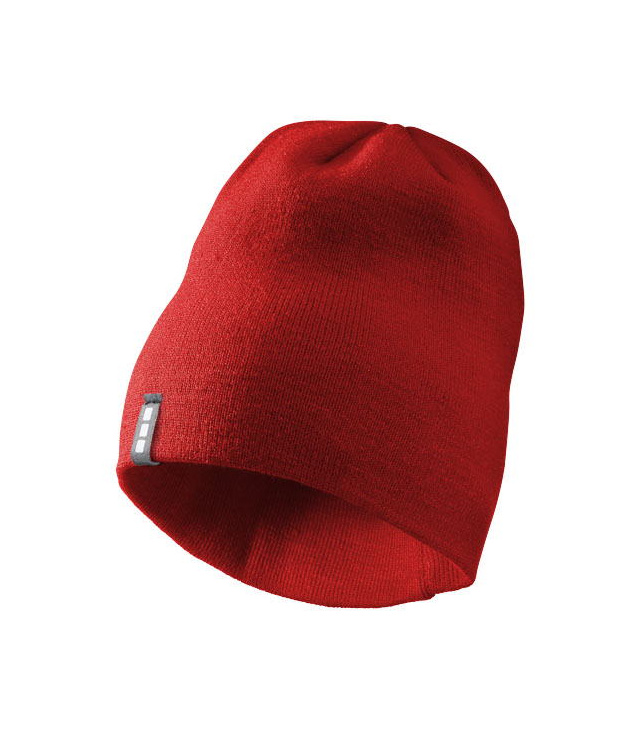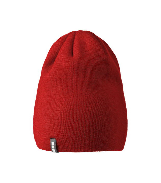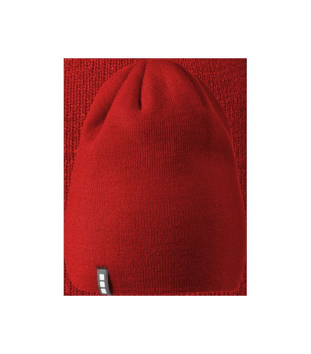 Dvouvrstvá čepice protáhlého tvaru (beanie). Štítek ve formě poutka se značkou.