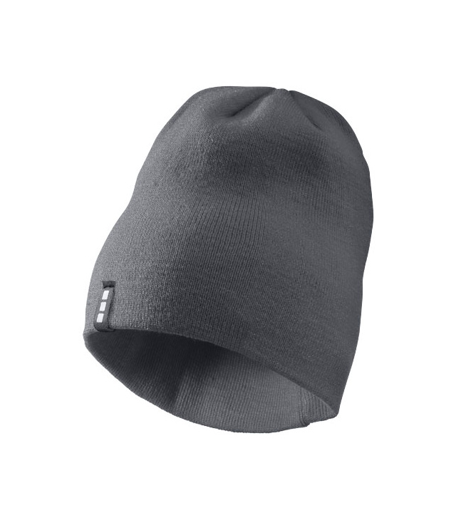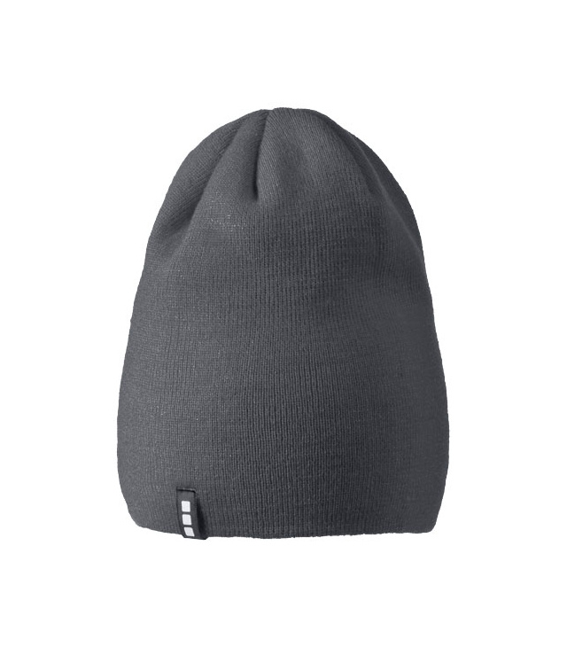 Dvouvrstvá čepice protáhlého tvaru (beanie). Štítek ve formě poutka se značkou.