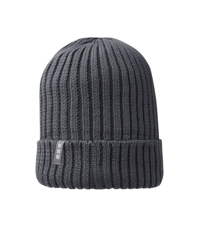 Reklamní čepice z udržitelných materiálů. Jednovrstvá beanie čepice s dvakrát přeloženým okrajem. Poutko se značkou.
